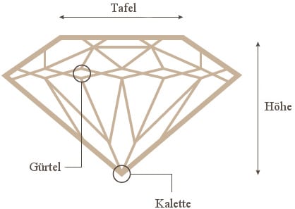 Die Tiefe eines Diamanten beschreibt das Verhältnis von Höhe und Durchmesser des Diamanten (Höhe:Breite). Wenn diese Proportionen von den Idealmaßen abweichen, wird das Licht nicht optimal reflektiert und der Diamant verliert an Brillanz.